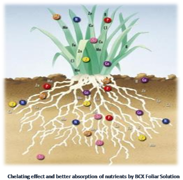 BCX TOTAL FOLIAR is rich in fulvic acids. It is enriched with all micro elements required by the plant in appropriate ratio.
